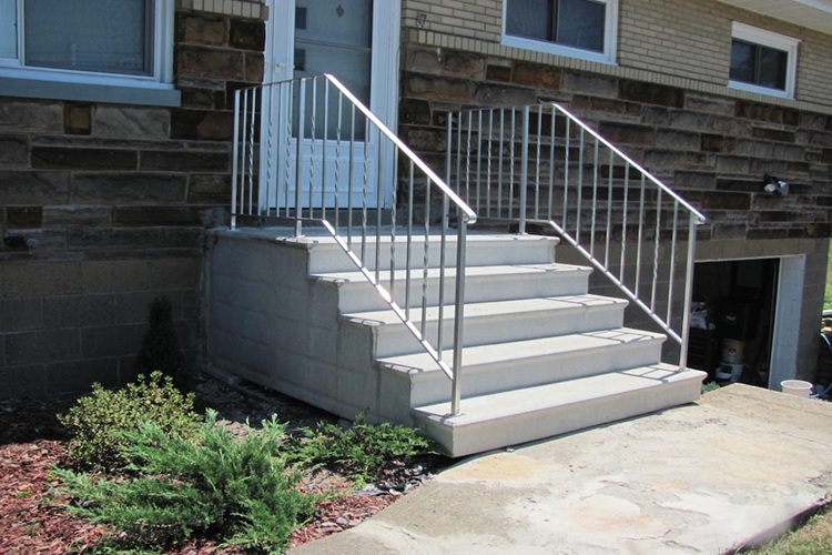 All Unit Steps have anchors cast in the concrete to securely mount our aluminum stock step railings. Step railings can also be powder coated a color to accentuate your house or building.