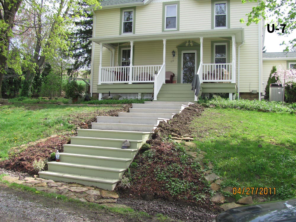 Unit Steps meet local building codes and are VA and FHA approved. Securely anchored railings are available. Styles of Unit Steps include Two Riser Step, Four Riser Step with 30-inch deep platform, Six Riser Step with 60-inch deep platform with back for side settings and steps into a hill.